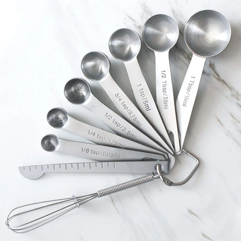 Package include: 1/8 TSP*1+1/4 TSP*1+1/2 TSP*1+3/4TSP *1+1TSP *1+1/2 TBSP*1+ 1 TBSP*1+Scale*1(1 PCS)