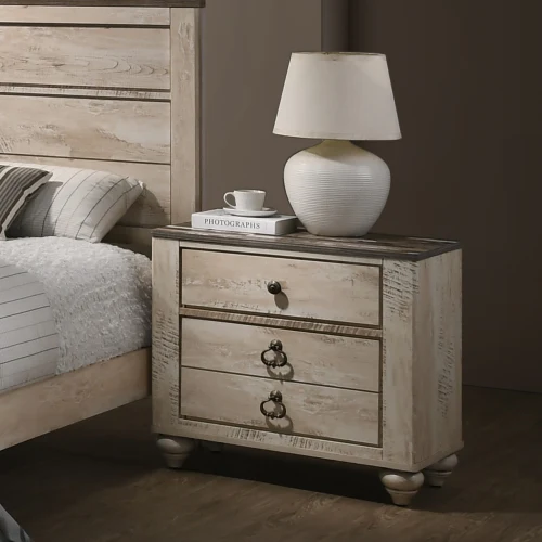 The industrial chic style of the Imerland Contemporary White Wash Finish Bedroom Set remakes your bedroom with contemporary cool. Designer details include antique bronze metal pulls in the front of the drawers, and the wood patch pattern on the top of the cases. Solid hardwoods with a white-wash rustic finish provide long-lasting quality construction. Luxurious touches of bun feet, bronze finished metal accents, wood framed mirror.