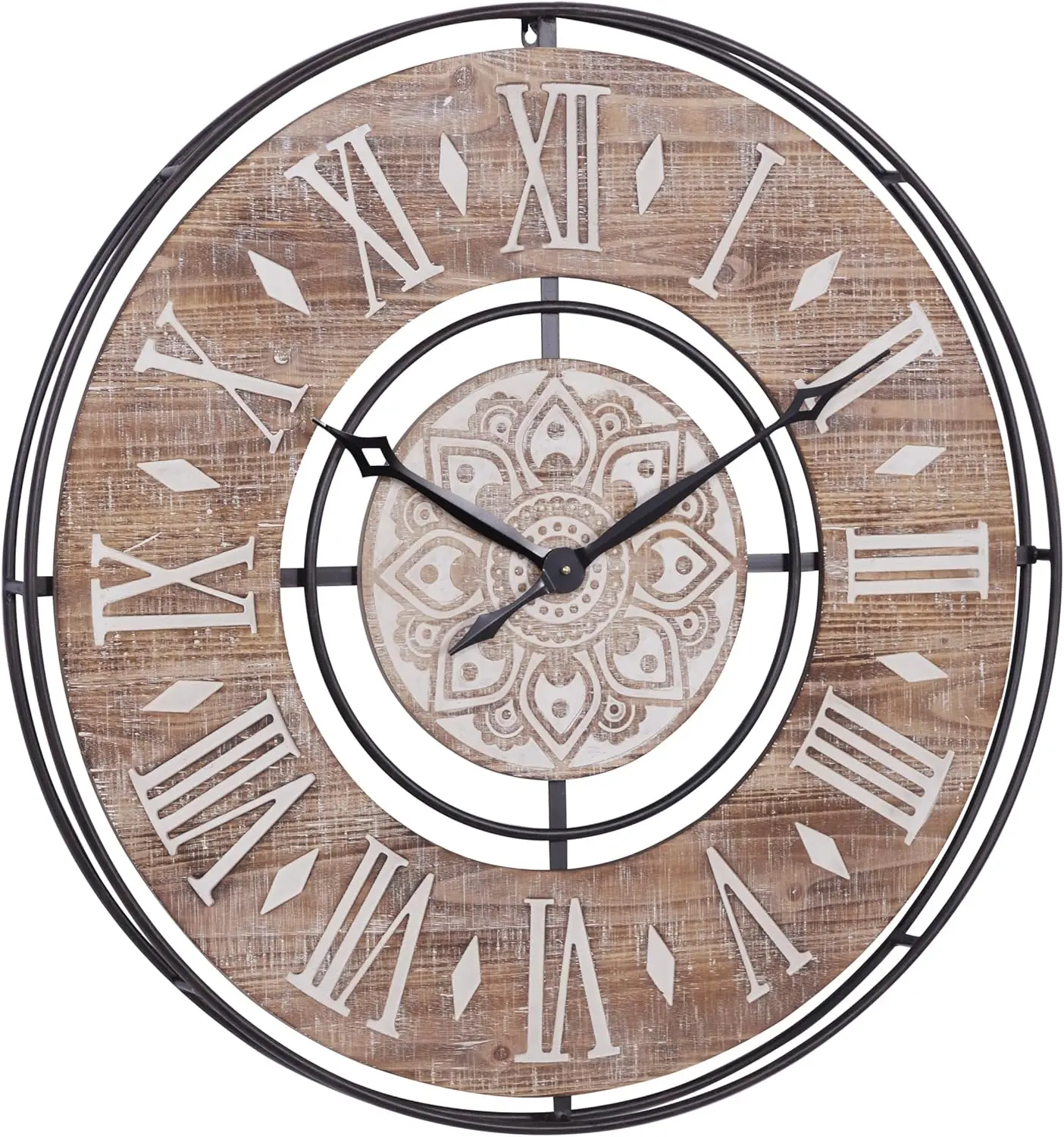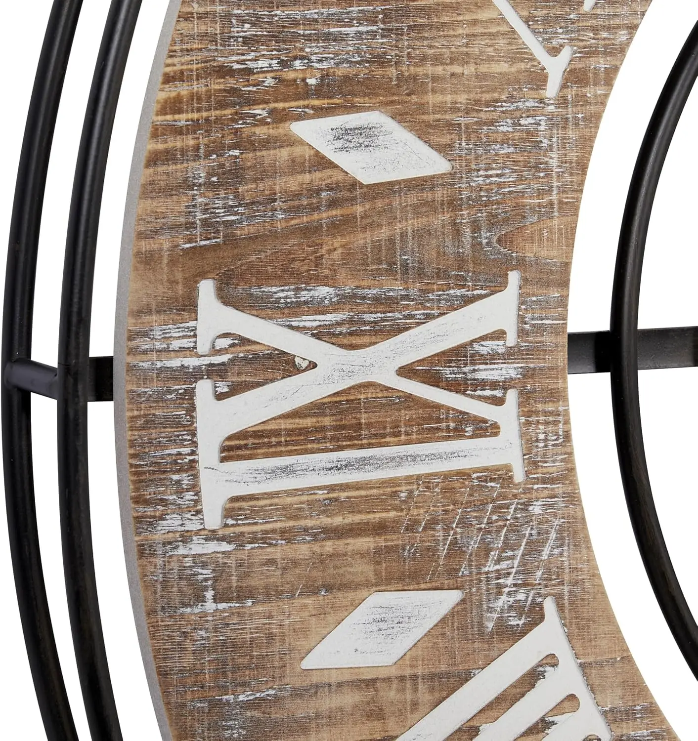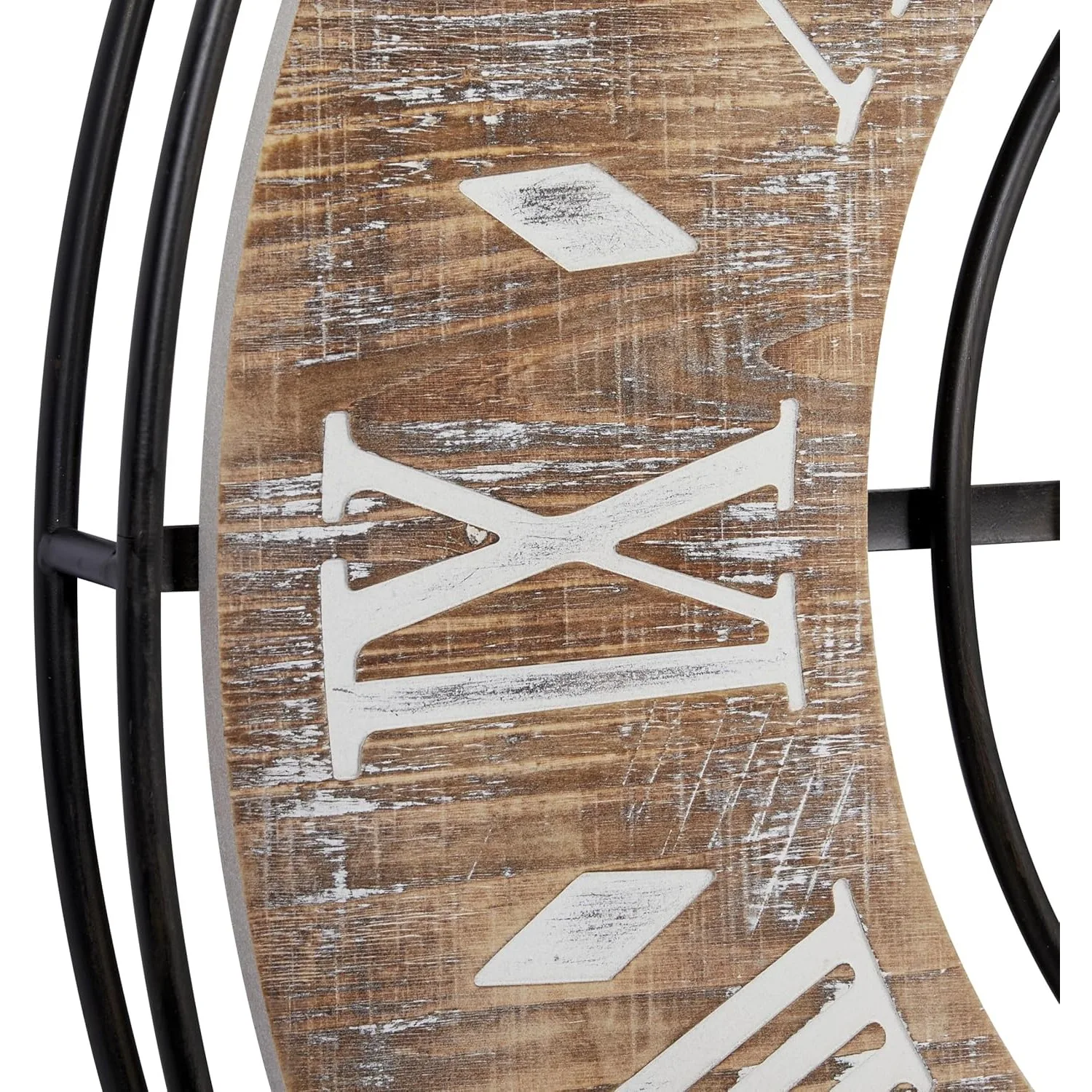 - Rustic Charm: This farmhouse-inspired metal and wood wall clock exudes cozy charm with its weathered textures, rustic finishes, and warm earthy tones, creating a wholesome atmosphere in your home.