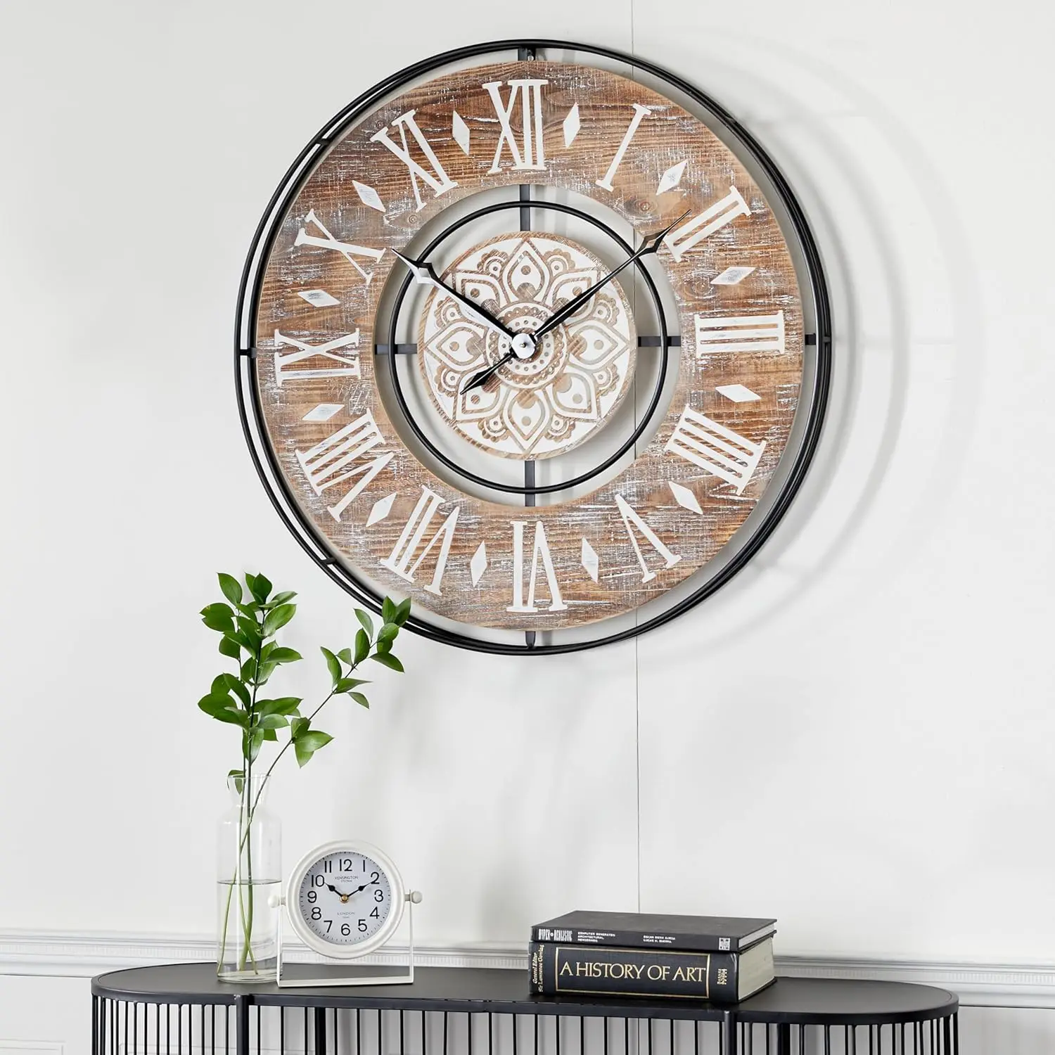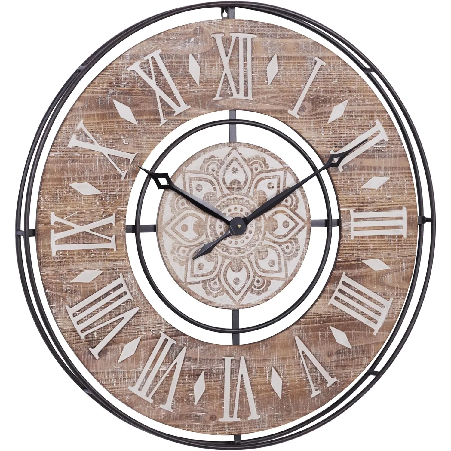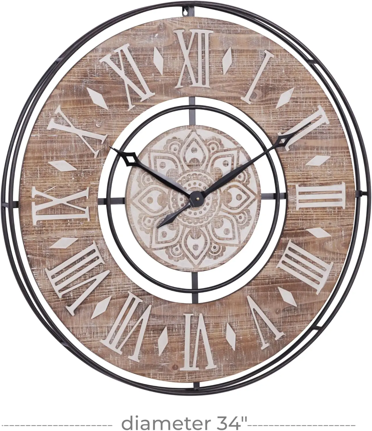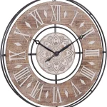 - Rustic Charm: This farmhouse-inspired metal and wood wall clock exudes cozy charm with its weathered textures, rustic finishes, and warm earthy tones, creating a wholesome atmosphere in your home.